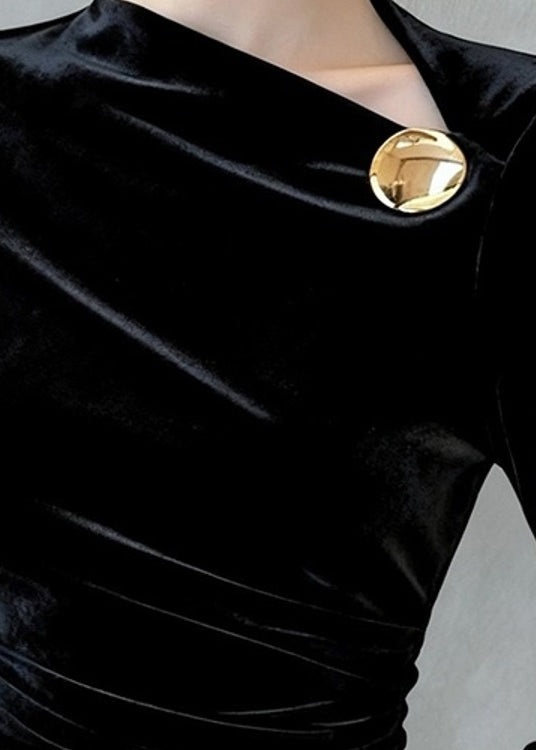 Schwarzes, schmal geschnittenes T-Shirt aus Seidenvelours mit Knittereffekt und ausgestellten Ärmeln im Originaldesign.