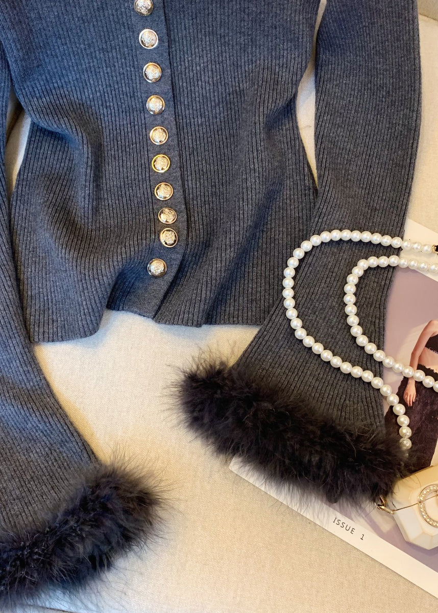 Schmal geschnittener, dunkelgrauer, flauschiger Patchwork-Strickpullover mit ausgestellten Ärmeln