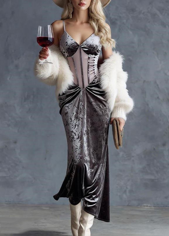 Slim Fit Grey Wrinkled Tulle Patchwork Spaghetti Strap Dress Sleeveless