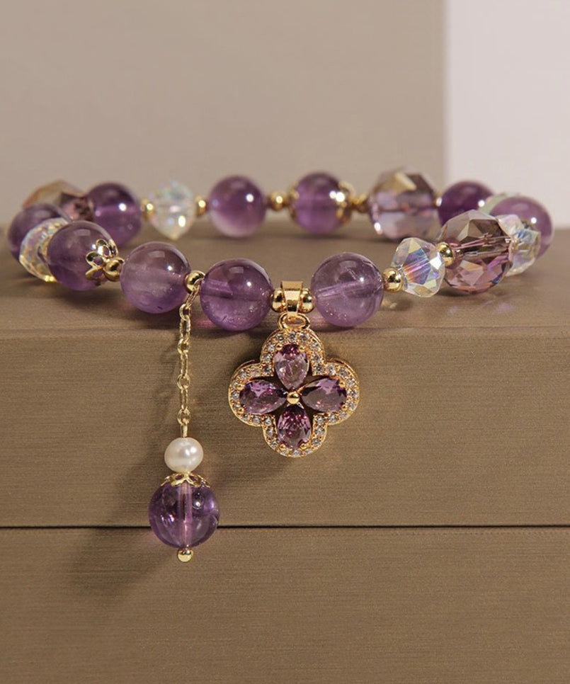 Stil Lila Kristall Intarsien Edelstein Stein Zirkon Vierblättriges Kleeblatt Quaste Bettelarmband