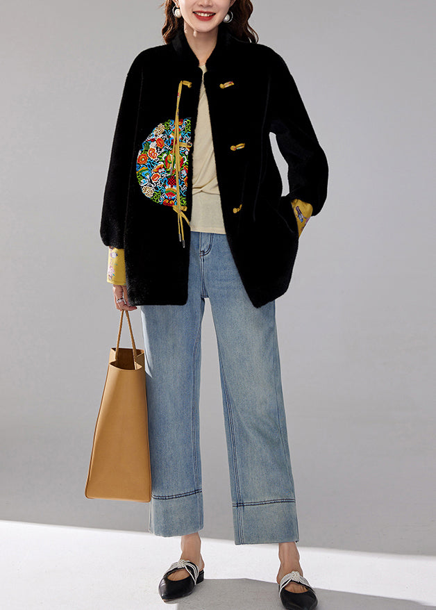 Vintage Wintermantel aus schwarzem, besticktem Kunstnerz-Samt mit Quasten