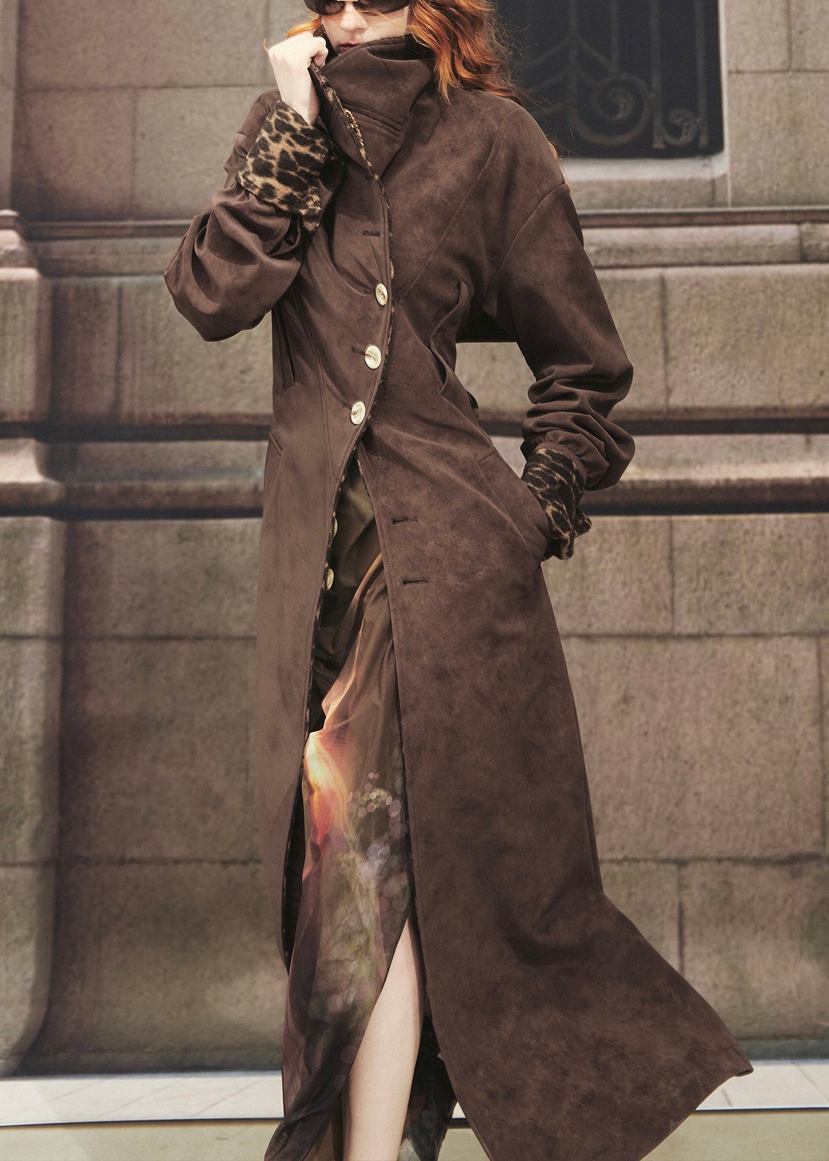 Vintage Schokoladenbrauner Leopardenmuster-Trenchcoat mit Bindegürtel aus Wildlederimitat, lang, Winter