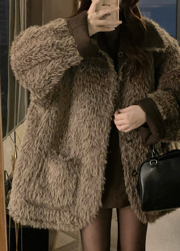 Vintage-Wintermantel aus dickem Leder und Pelz mit Peter-Pan-Kragen, beidseitige Gebrauchsspuren an den Knöpfen.