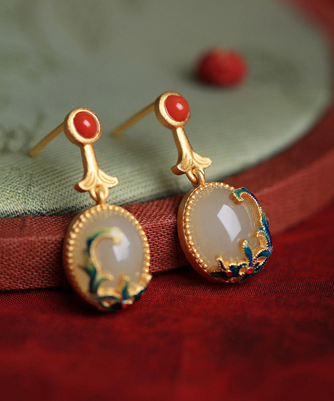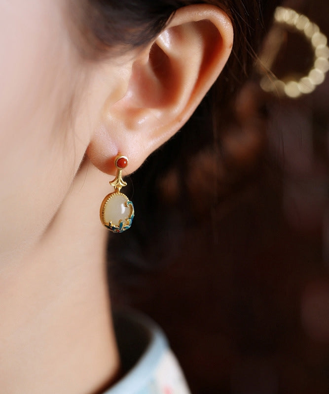 Vintage Gelbe Kupfer Overgild Achat Emaille Tropfen Ohrringe