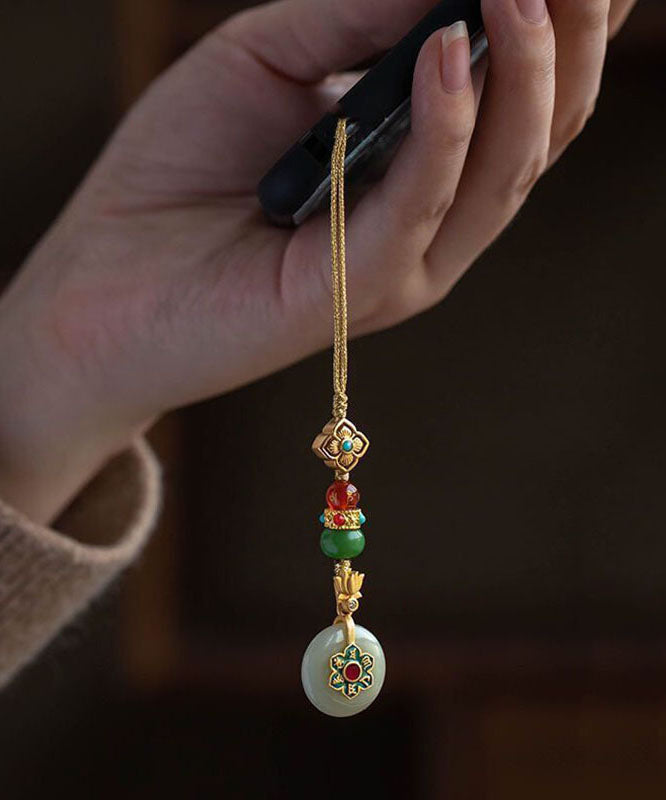 Vintage-Handyketten aus gelbversilbertem, vergoldetem Jade, Türkis, Lotus und vierblättrigem Kleeblatt