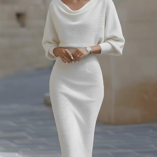 - Design: Draped cowl neckline, batwing long sleeves, and a form-fitting midi pencil skirt that accentuates the waistline for a sculpted silhouette