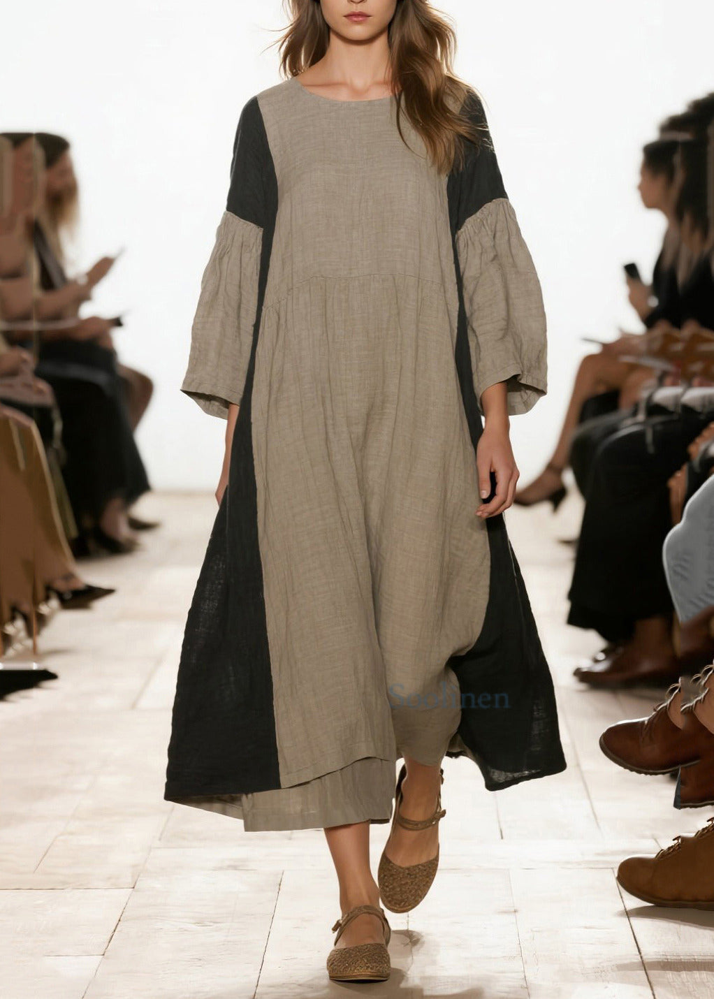 Graues, übergroßes Patchwork-Leinenkleid für Damen mit Armbandärmeln