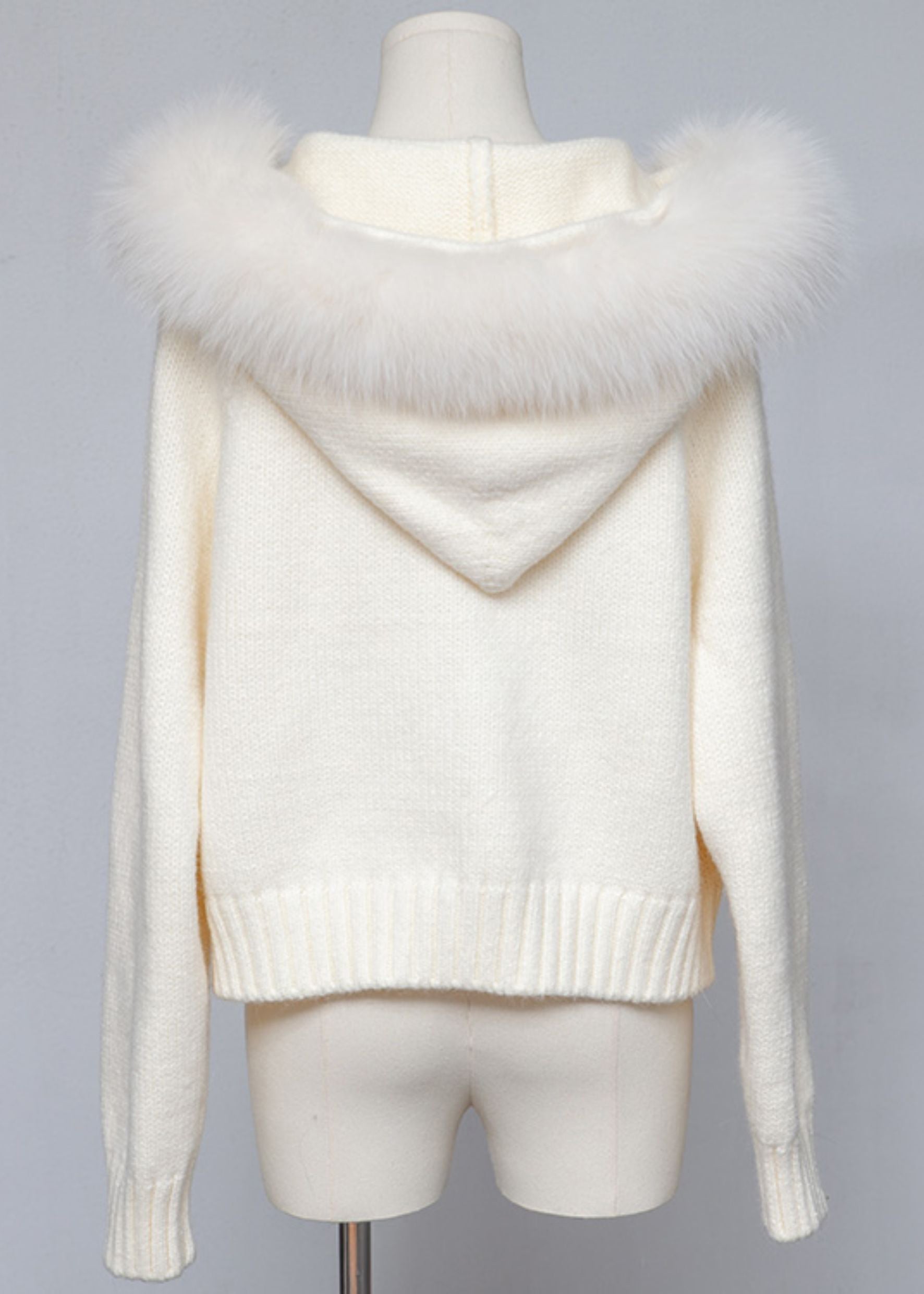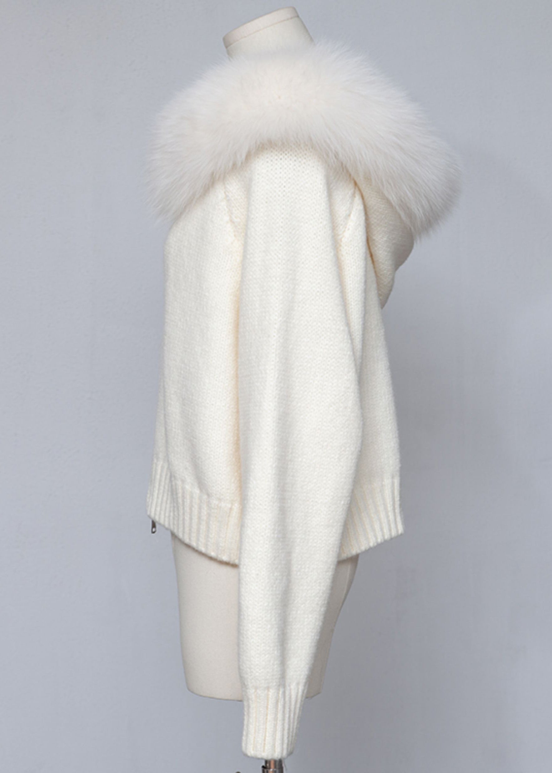 Weißer Damen-Strickmantel mit Kapuze, Reißverschluss und Patchwork-Design