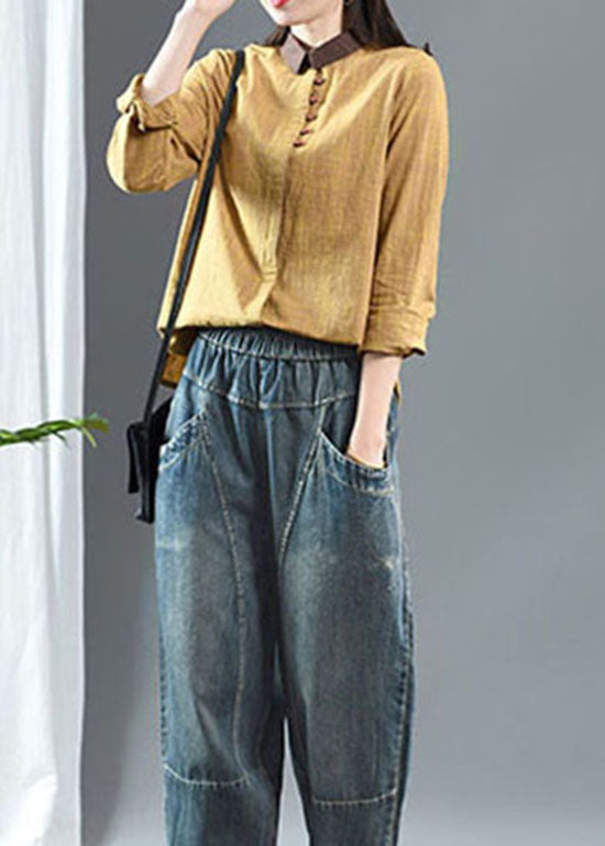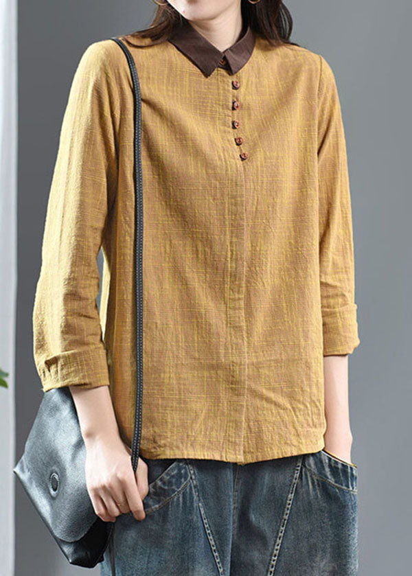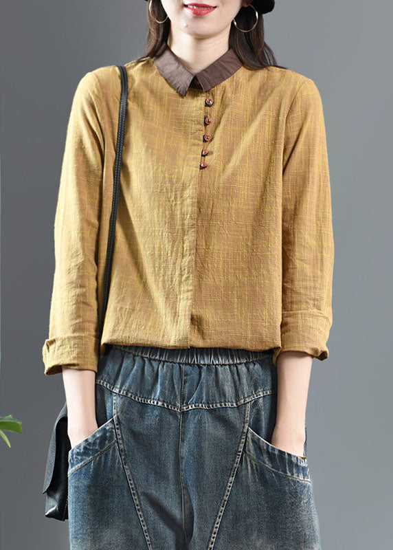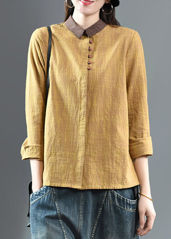 Gelbes Patchwork-Baumwolltop mit Peter-Pan-Kragen und Knopfleiste