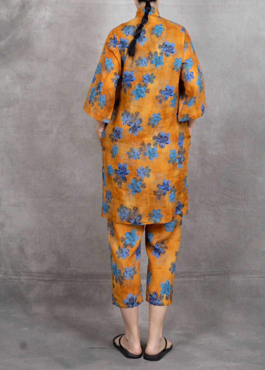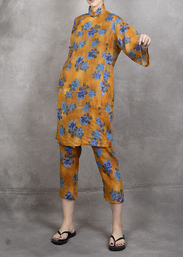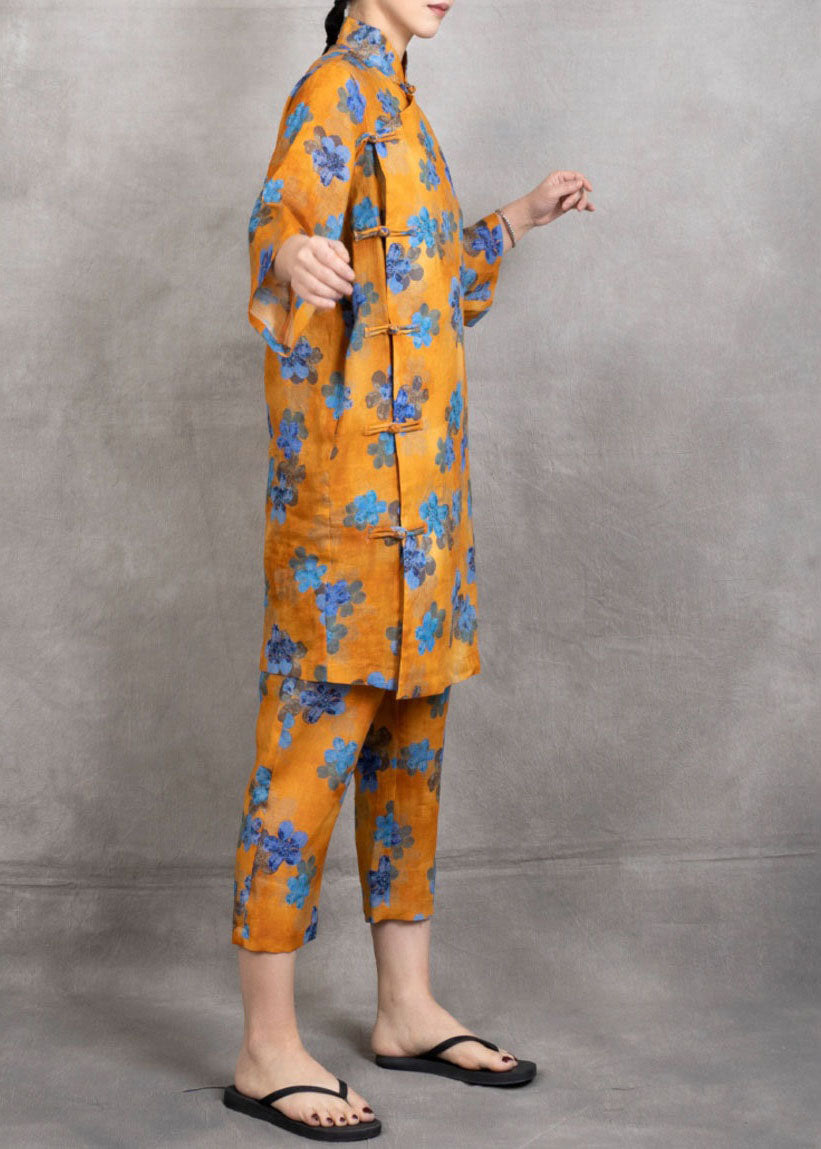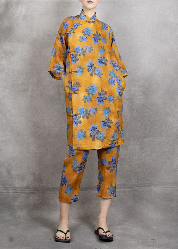 Gelb Print Patchwork Leinen Zweiteiler Set Chinesischer Knopf Sommer