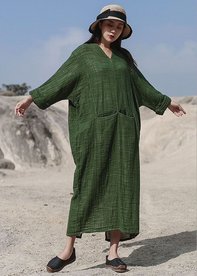 Black Pockets Cotton Maxi Dresses V Neck Spring