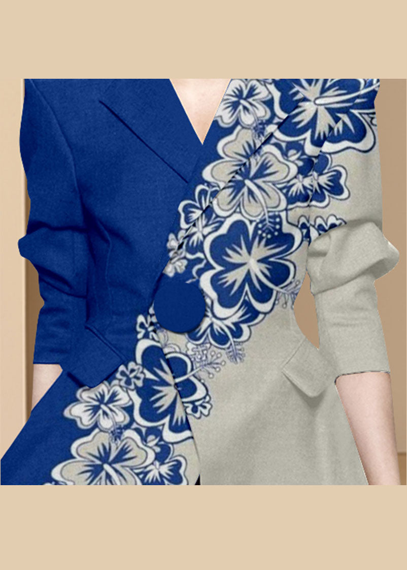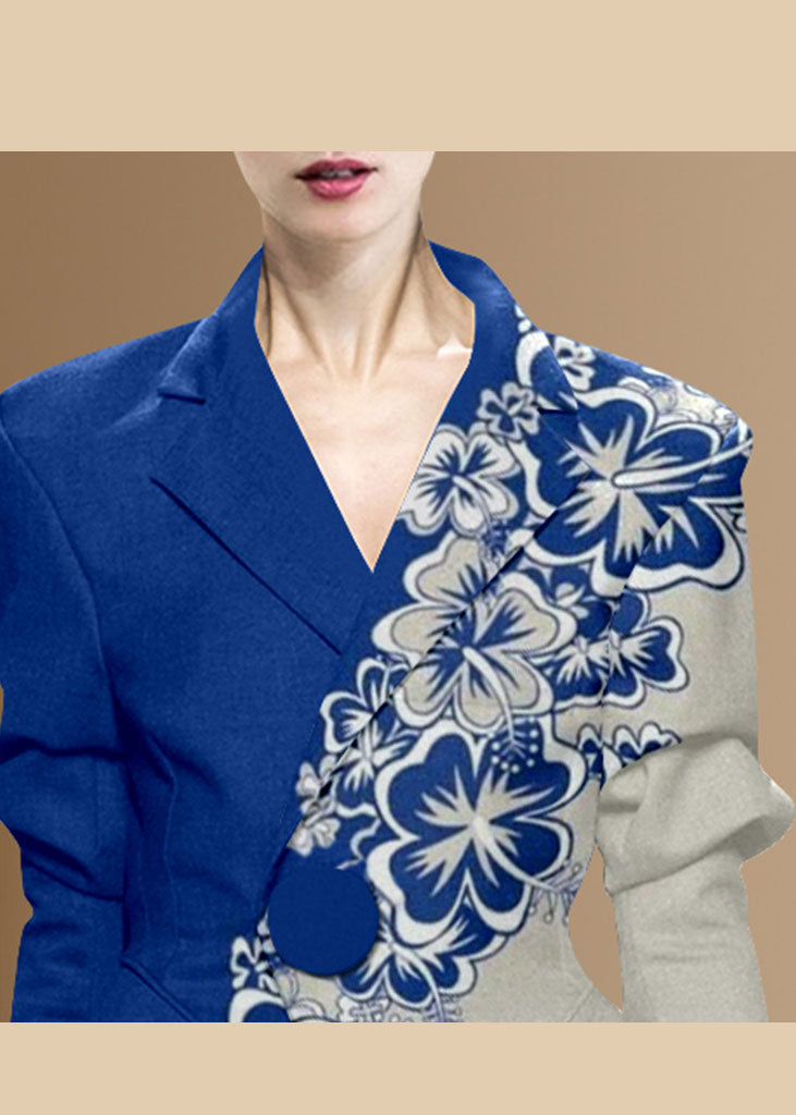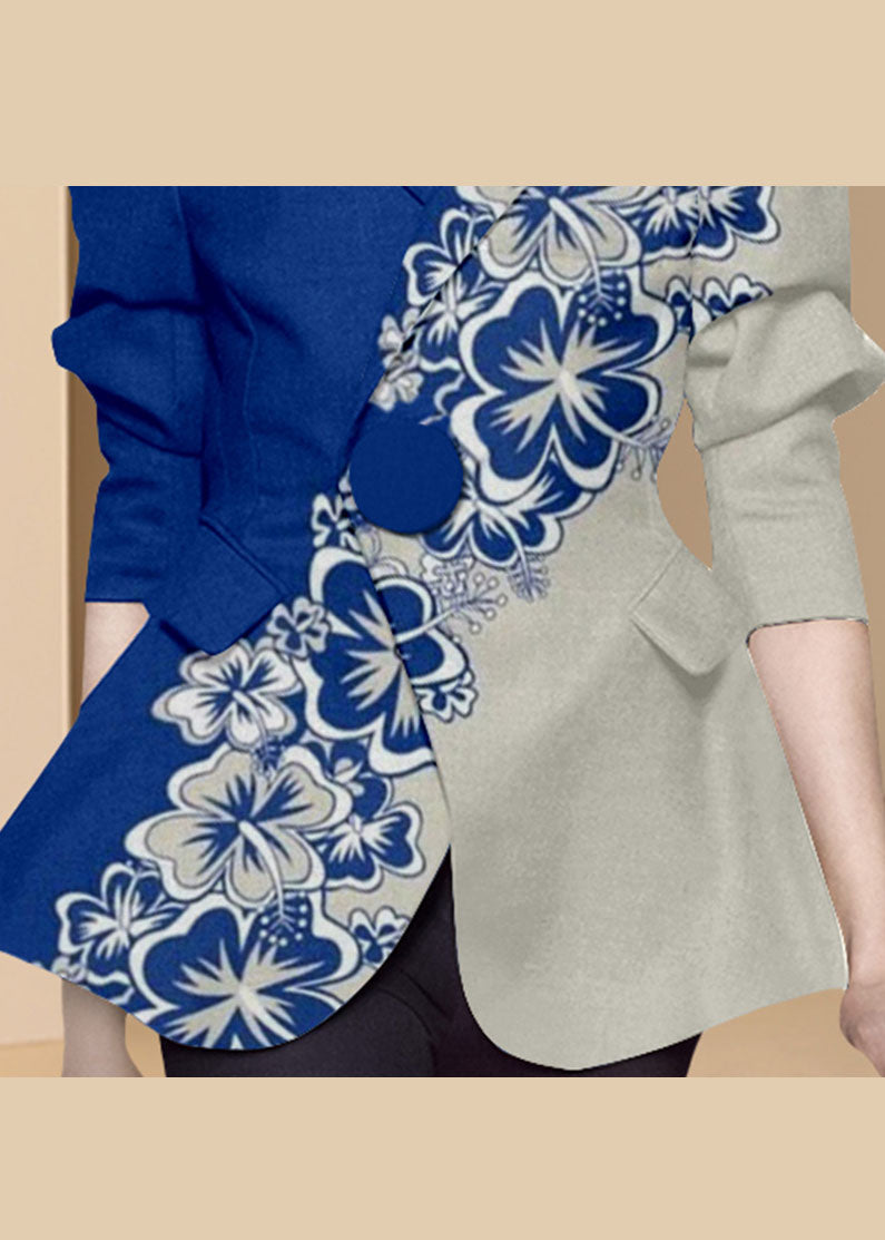 Blue Grey Print Slim Fit Coats Button Peter Pan Collar Long Sleeve