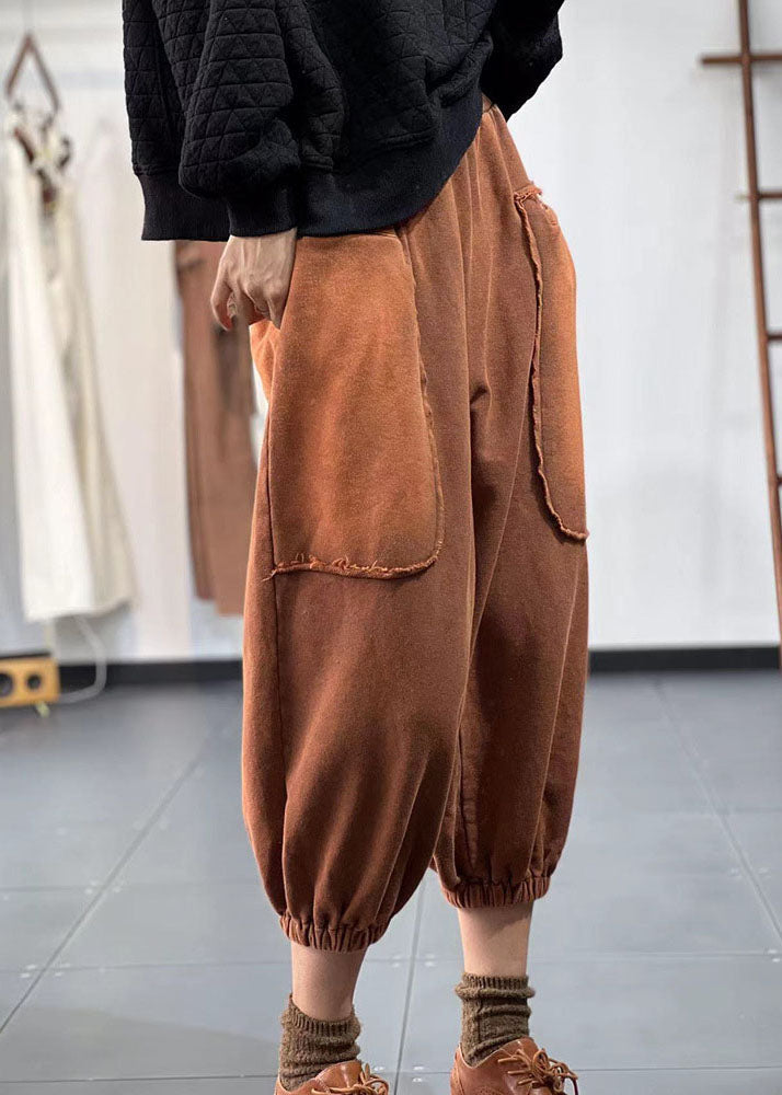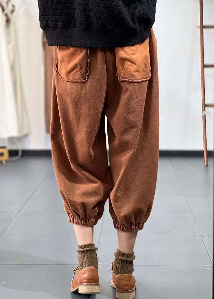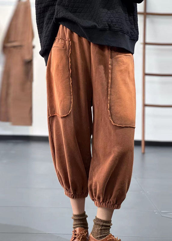 Boho Coffee Elastic Waist Pockets Patchwork Applique Cotton Harem Pants Fall