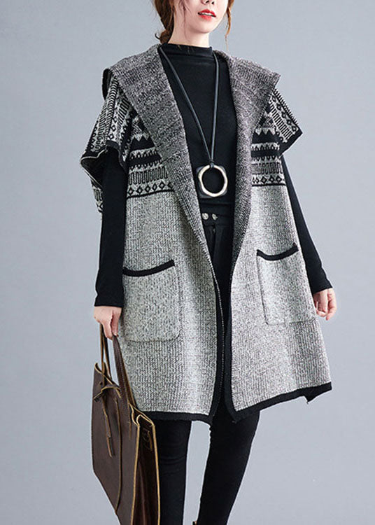Boho Grey hooded Short Sleeve Pockets Loose Fall Knit Sweater Cardigans