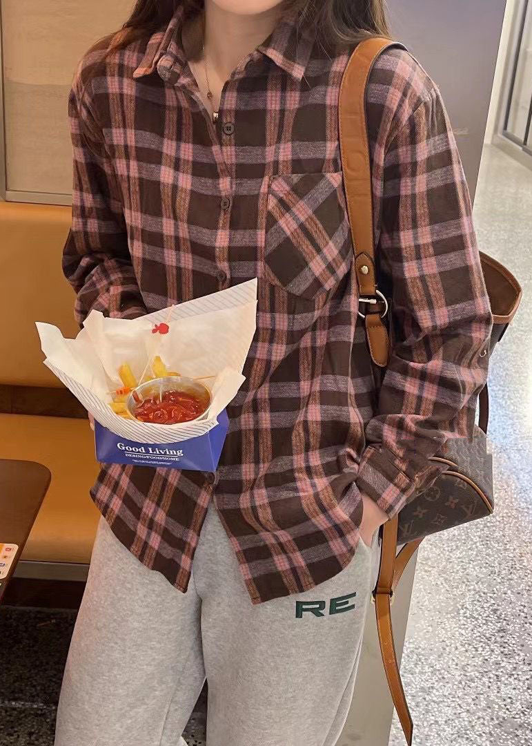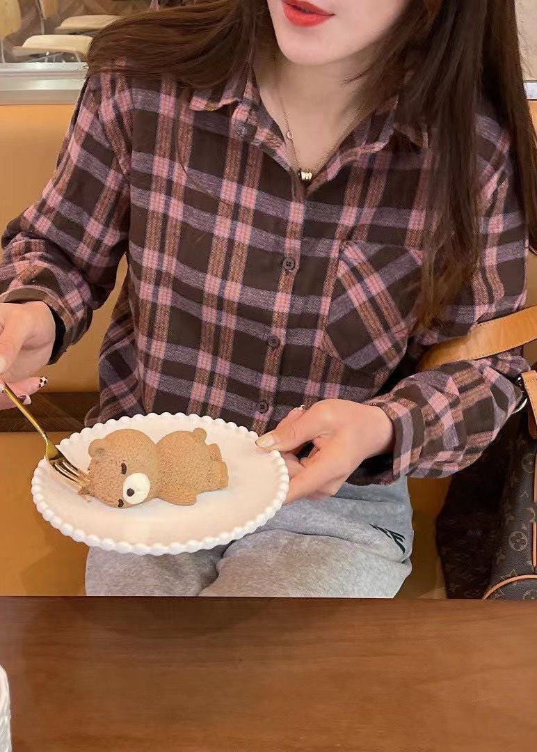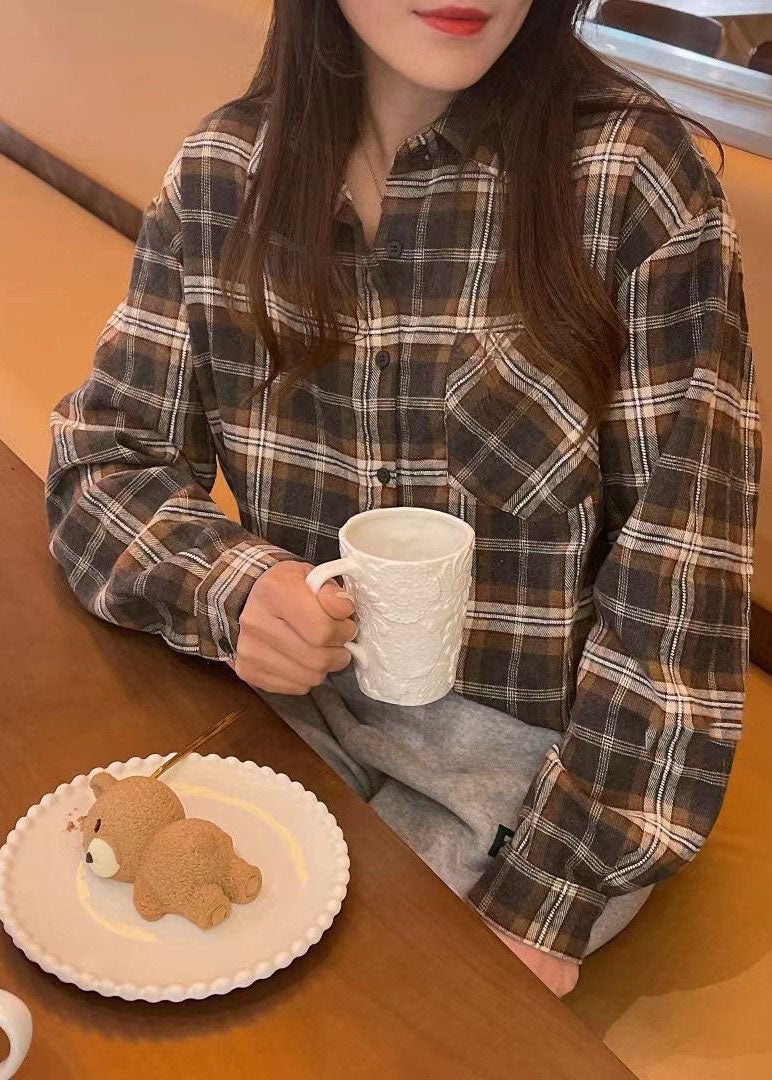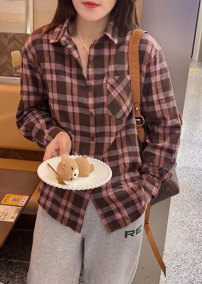 Boutique Red button Peter Pan Collar Plaid Blouses Spring
