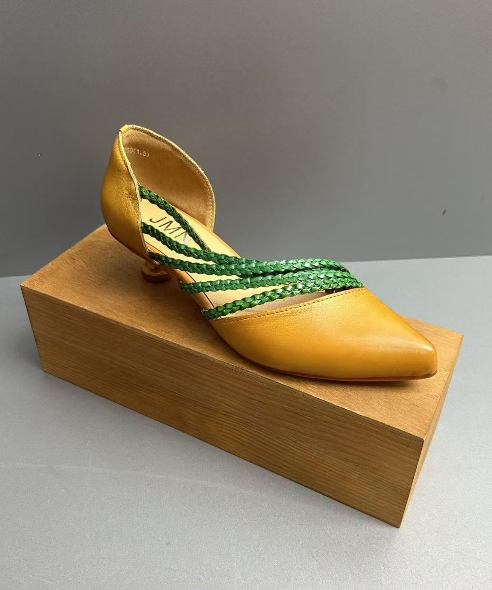 Brown Cowhide Leather Splicing Kitten Sandals Pointed Toe