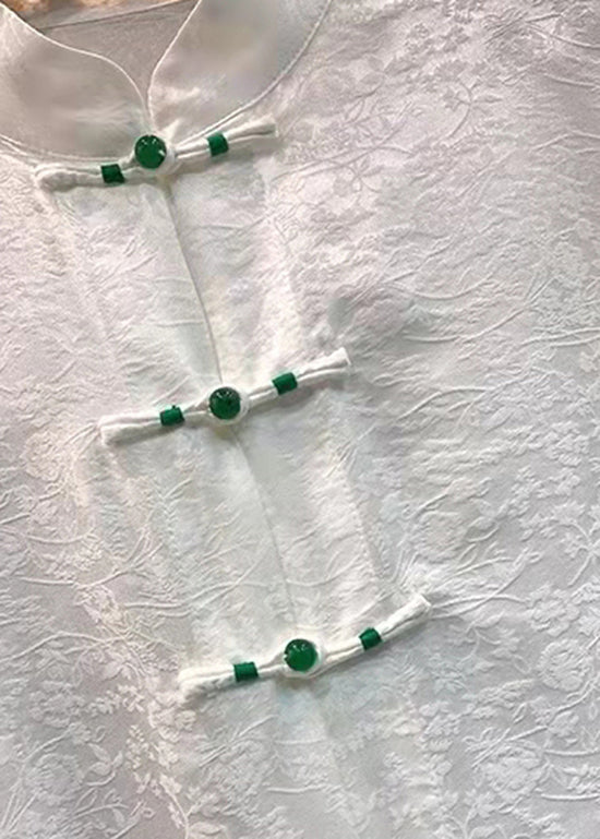 Chinese Style White Stand Collar Button Jacquard Silk Blouse Tops lantern sleeve