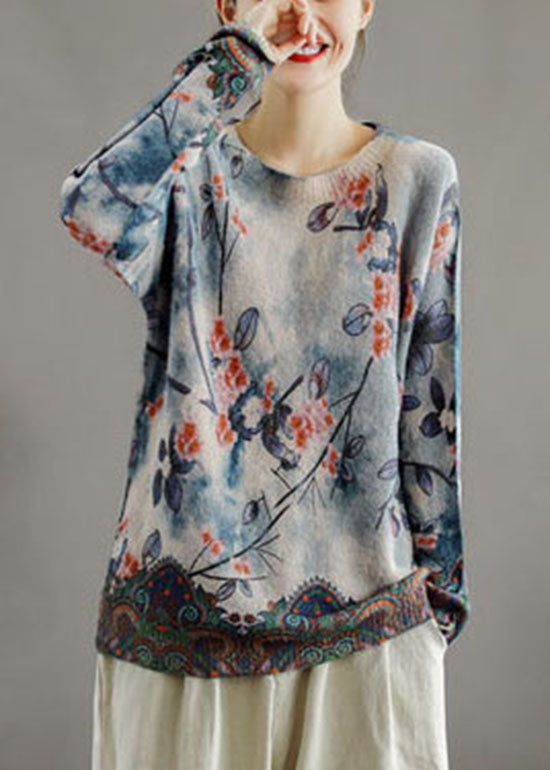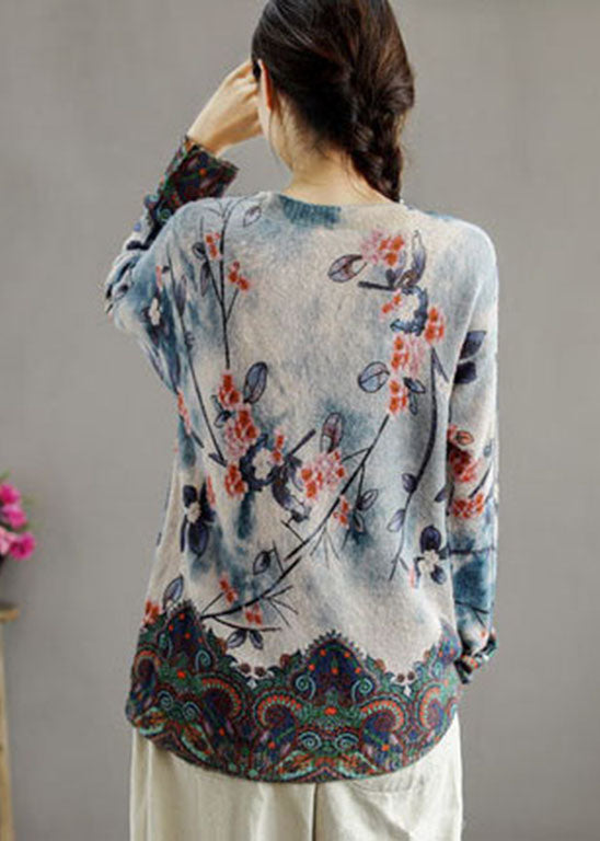 Classy Khaki O-Neck Print Mink Hair Knitted Sweaters Long Sleeve