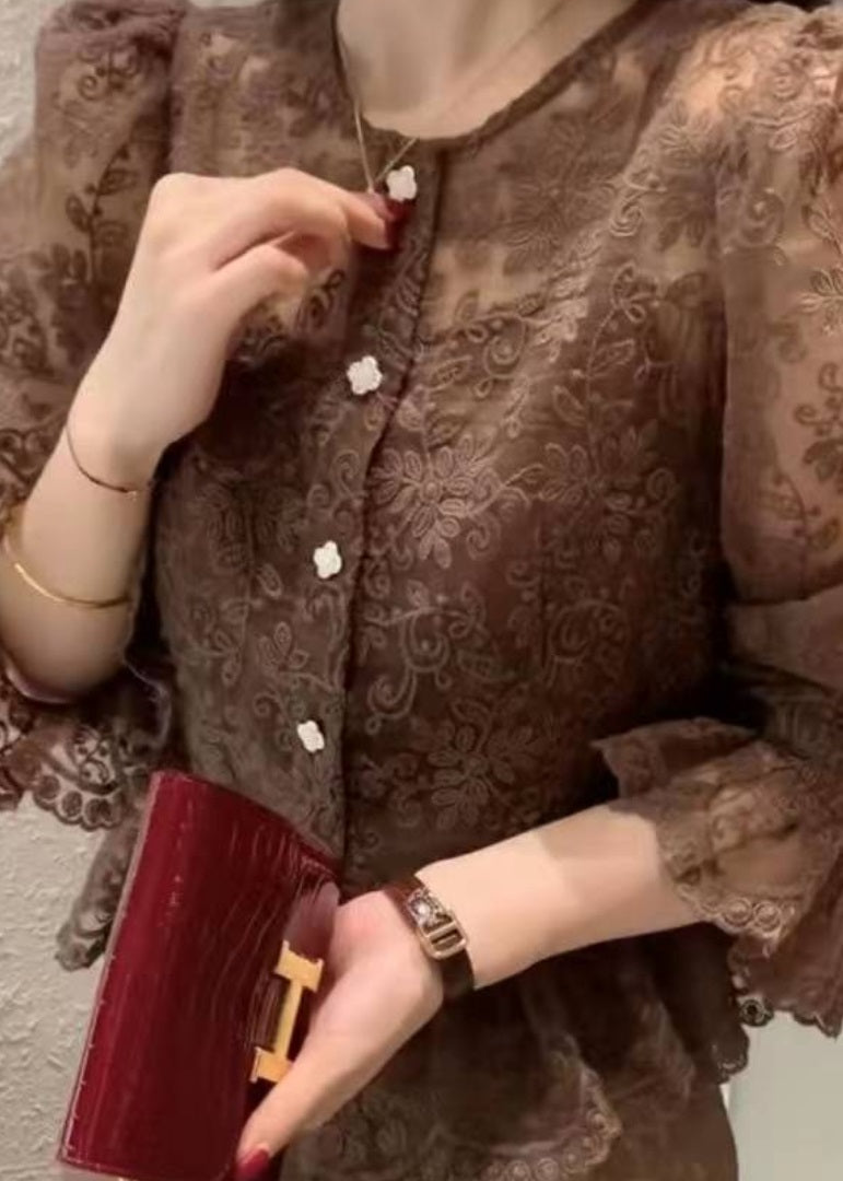 Coffee Women Lace coat Spaghetti Strap top Sets two Pieces Ruffled flare sleeve