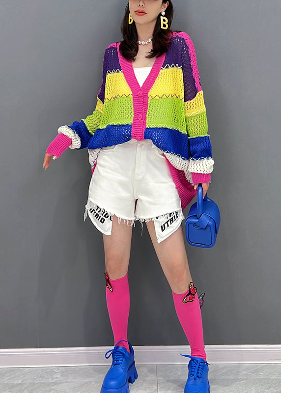 Cute Red V Neck Hollow Out Striped Knit Cardigan Fall