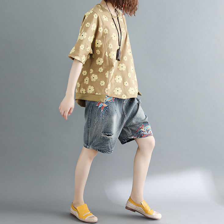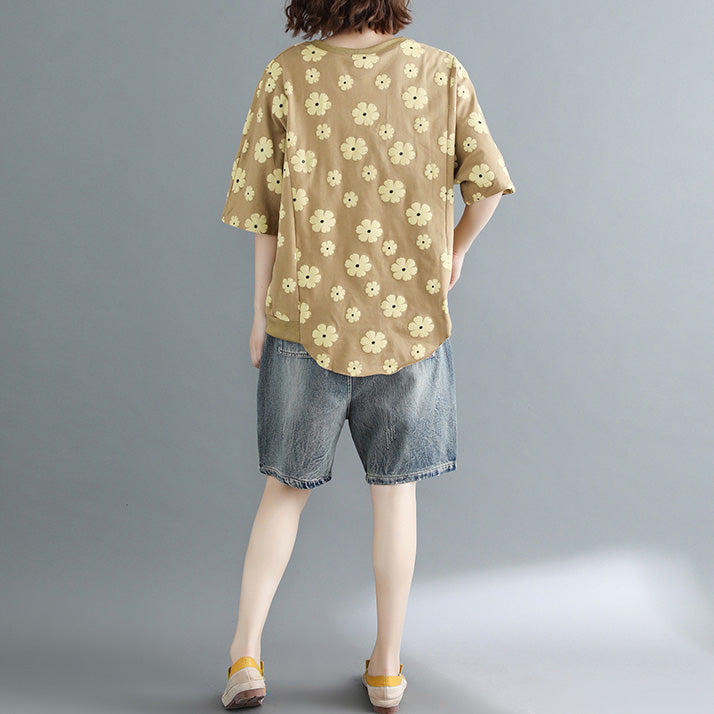 DIY Half sleeve cotton clothes For Women plus size Wardrobes yellow print Plus Size Clothing top