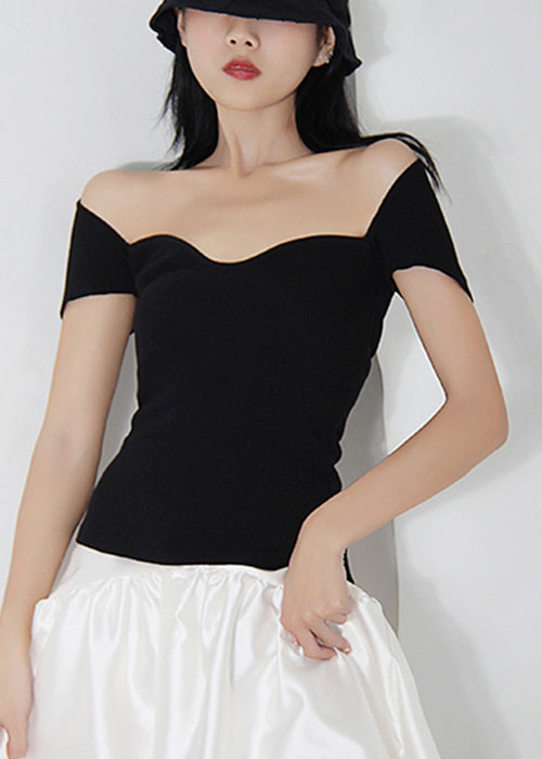 Fitted Black Cold Shoulder Cotton Top Short Sleeve