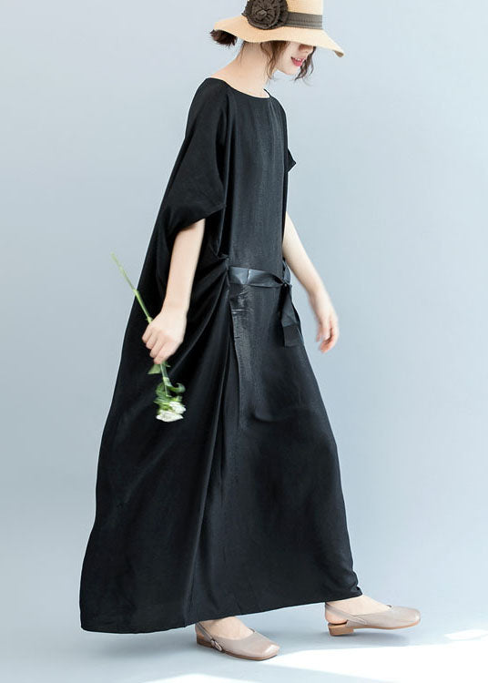 French Black Cinched Loose wrinkled Long Dress Bat wing Sleeve