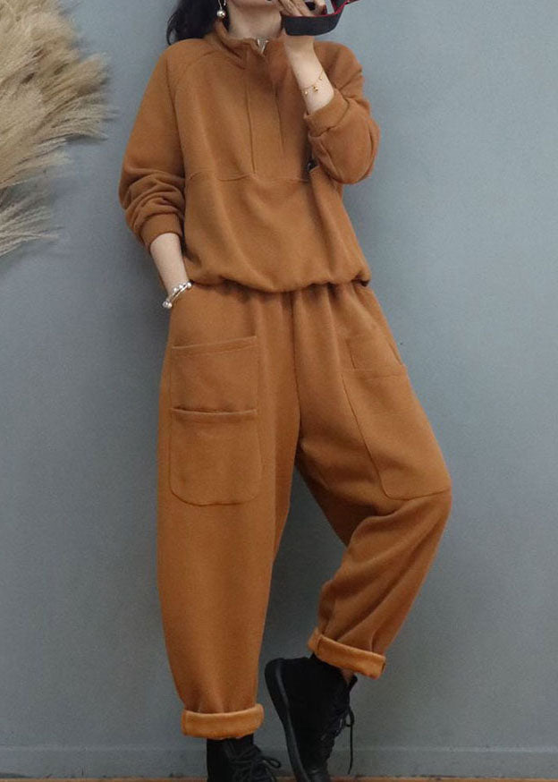 French Khaki Zip Up Patchwork Fine Cotton Filled Two Piece Set Winter