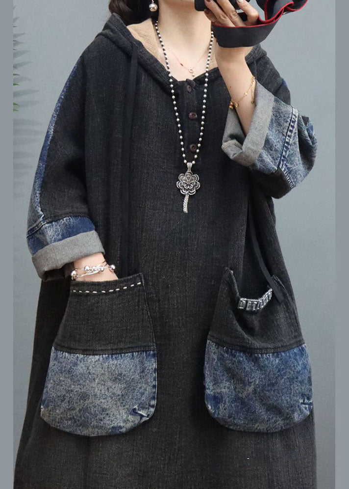 Handmade Black Hooded Pockets Dress Spring