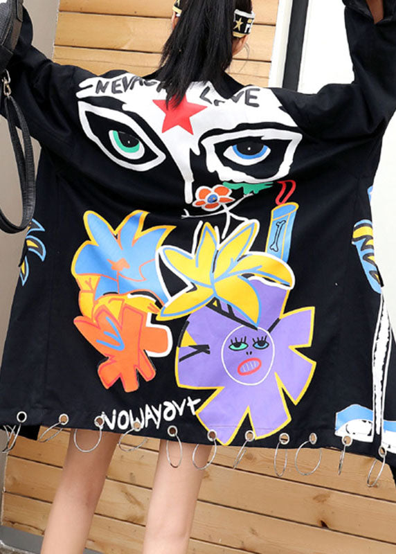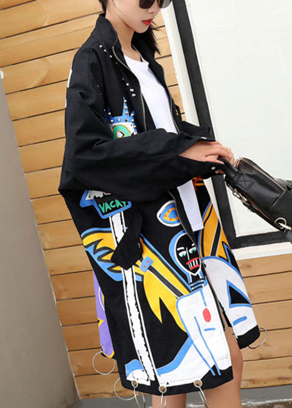 Loose Black Nail Bead Print Zippered Fall Long Sleeve Coat Trench Coat
