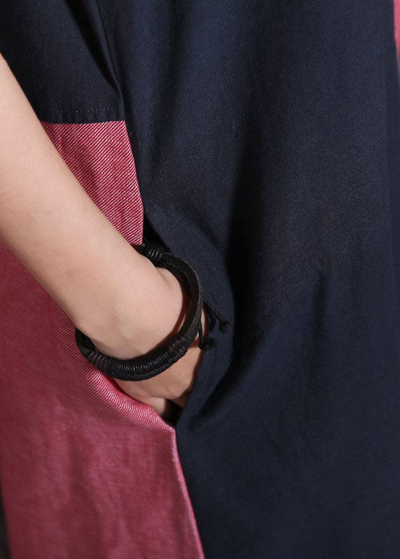 Loose Blue Patchwork Cotton Vacation Dresses Short Sleeve