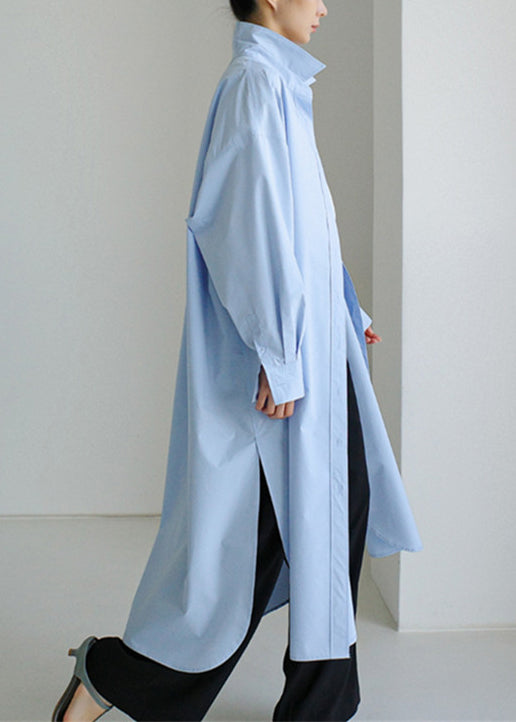 Loose Blue Peter Pan Collar Side Open Cotton Shirts Long Sleeve
