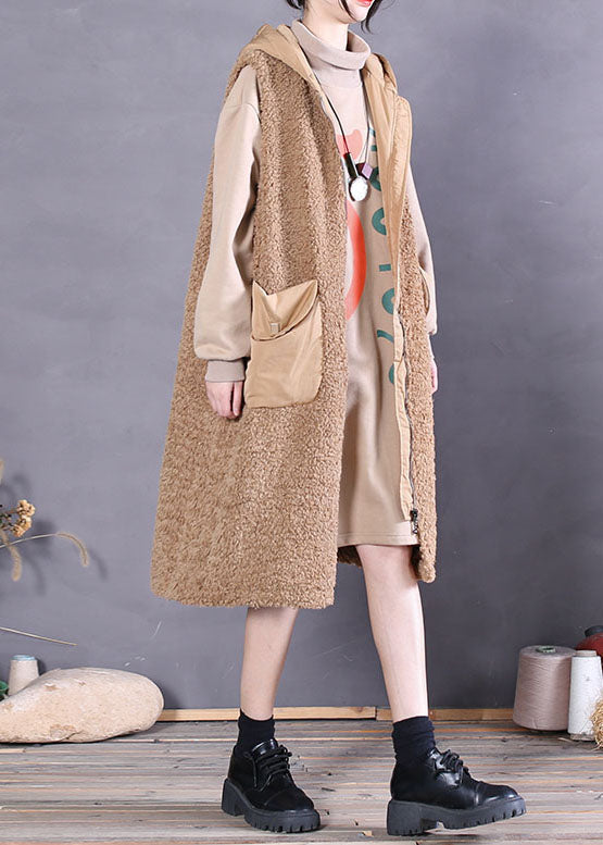 Modern Khaki Hooded Pockets Faux Fur Tank Tops Sleeveless