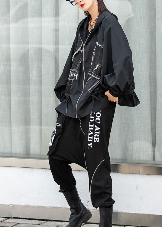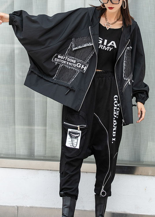 New Black Bat Wing Sleeve Zippered Patchwork Print Fall Coat