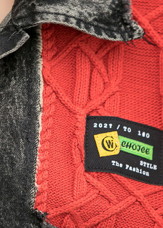 New Denim Patchwork Knit Button Pockets Fall Long Sleeve Jacket
