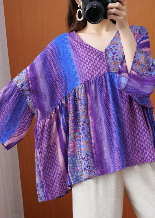 Organic Purple Flare sleeve V Neck Patchwork Print Fall Top