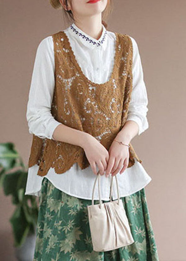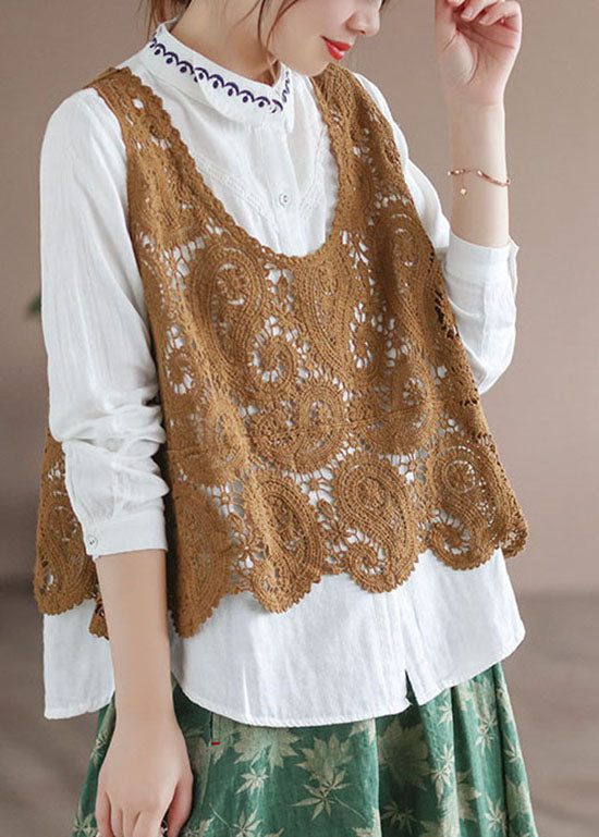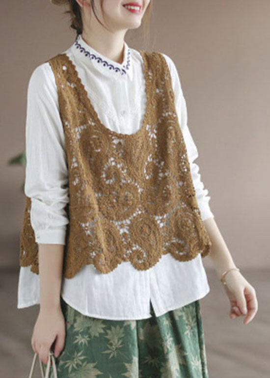 Plus Size Yellow U Neck Hollow Out Knit Tanks Sleeveless