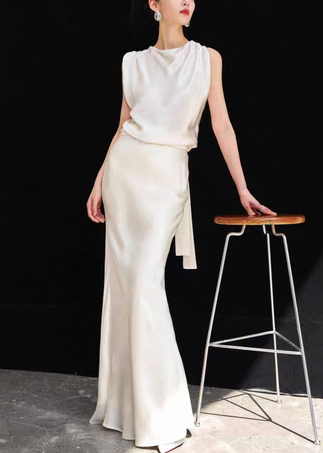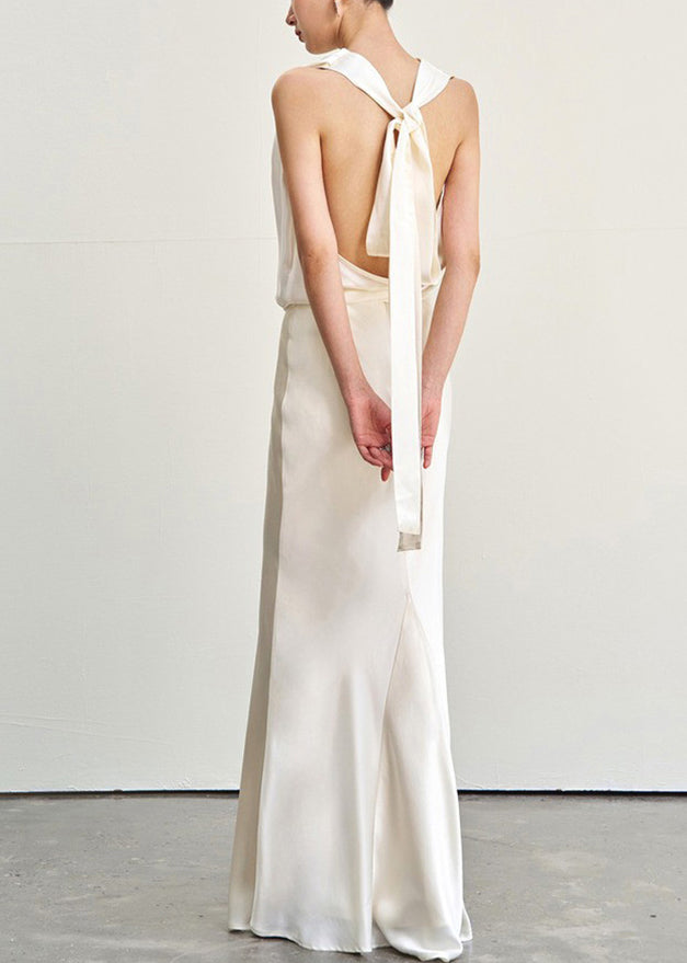 Slim Fit Beige Backless Lace Up Tops And Skirts Silk Two Piece Set Sleeveless