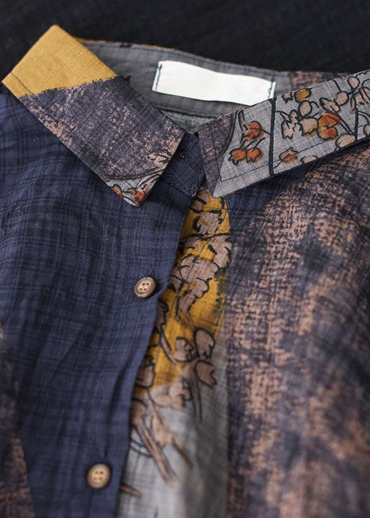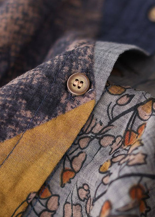 Style Blue Yellow Peter Pan Collar Print Linen Blouse Tops Spring