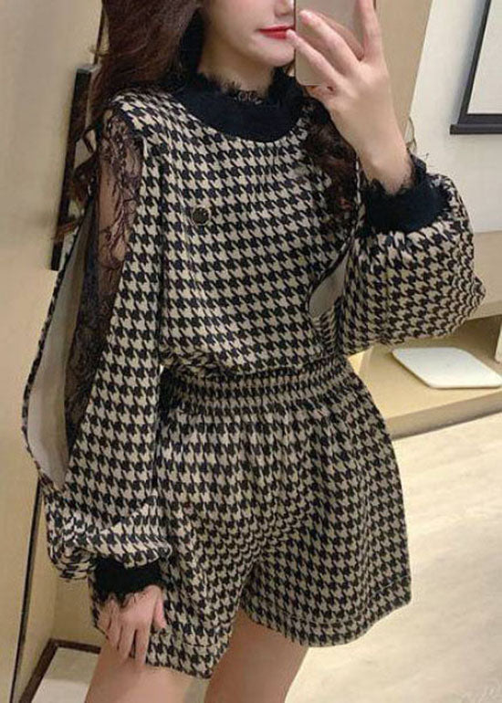 Style White Lace Patchwork Stand Collar tops shorts Two-Piece Set Spring