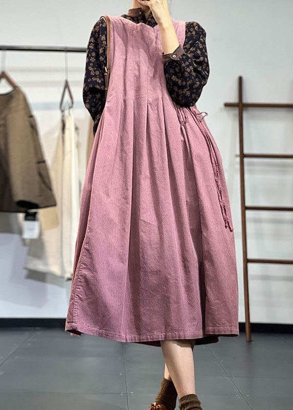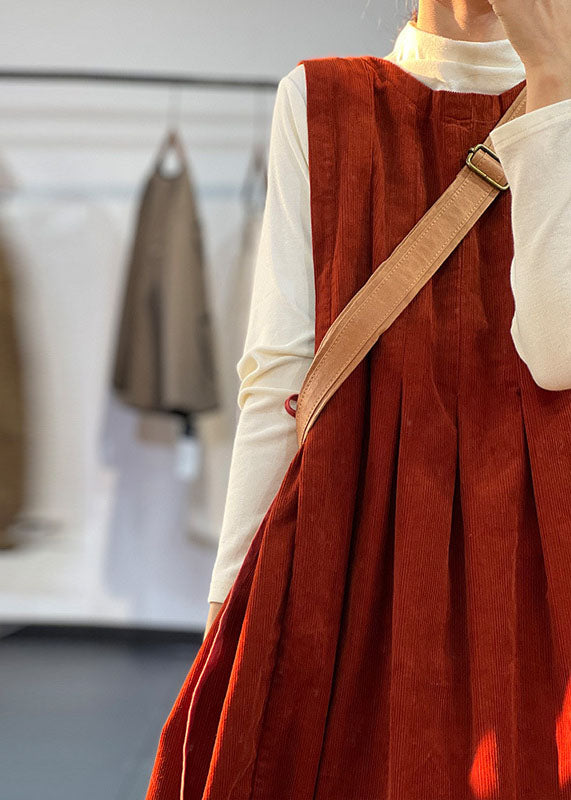 Stylish Red O-Neck Exra Large Hem Corduroy Pleated Dresses Sleeveless