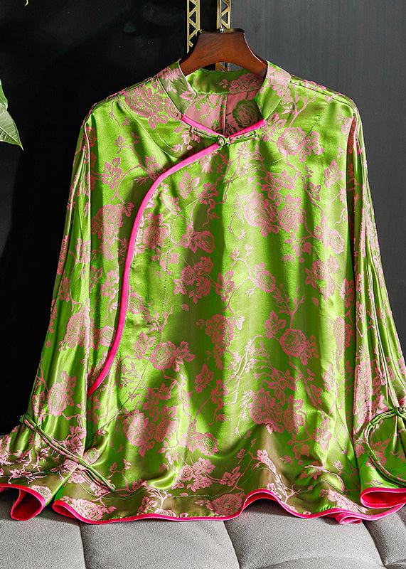 Vintage Green Stand Collar Chinese Button Patchwork Jacquard Silk Shirt Long Sleeve