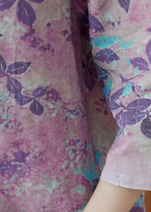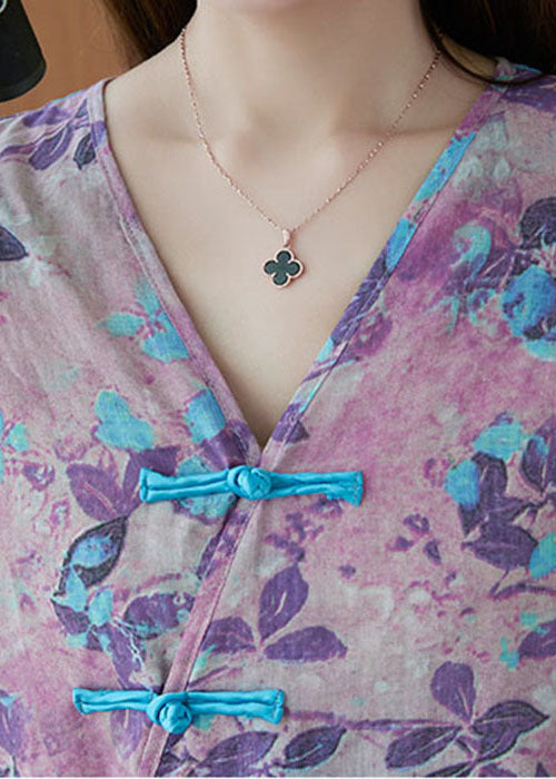 Vintage Purple V Neck Button Print Blouse Tops Half Sleeve