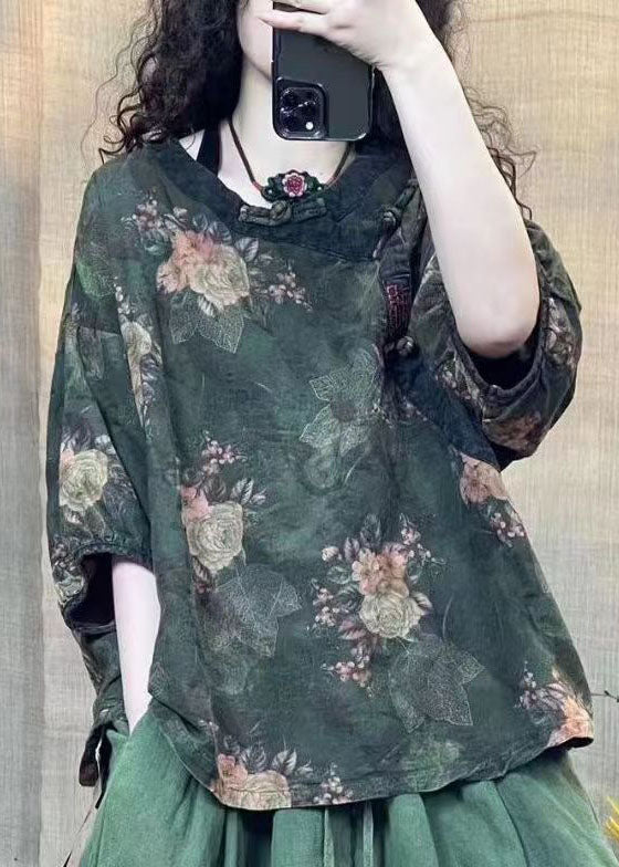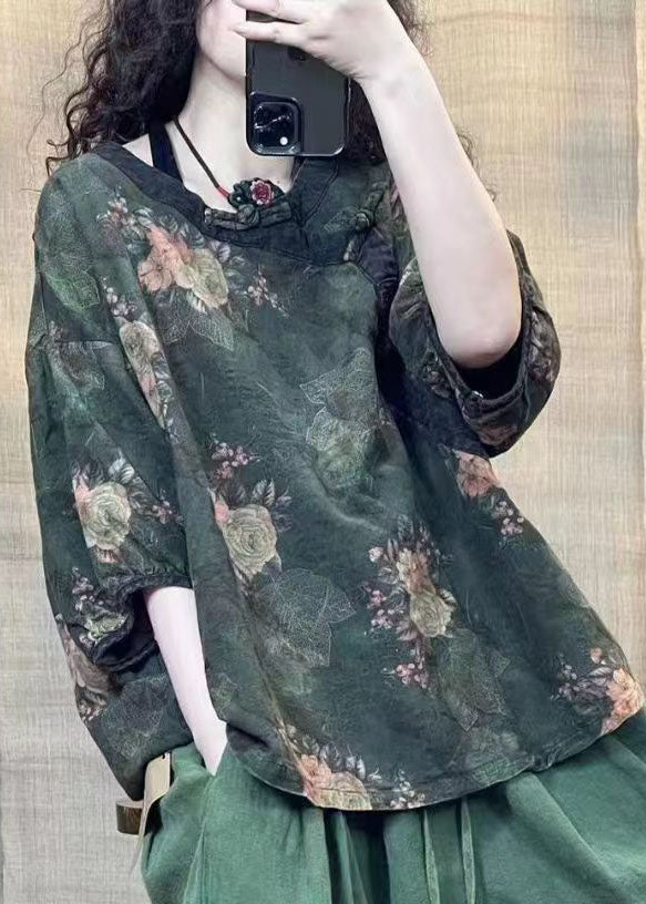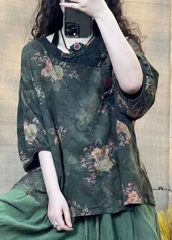 Vintage Red O Neck Print Oriental Button Linen Shirts Bracelet Sleeve