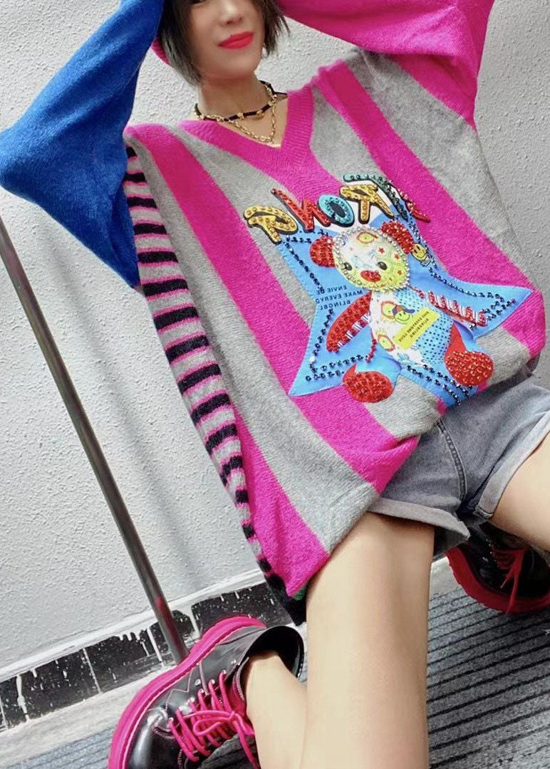 Vintage Rose Loose V Neck Print Fall Character Knitwear Coat