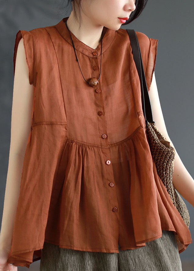 Top de lino con cuello alto y diseño de patchwork arrugado en azul artístico sin mangas