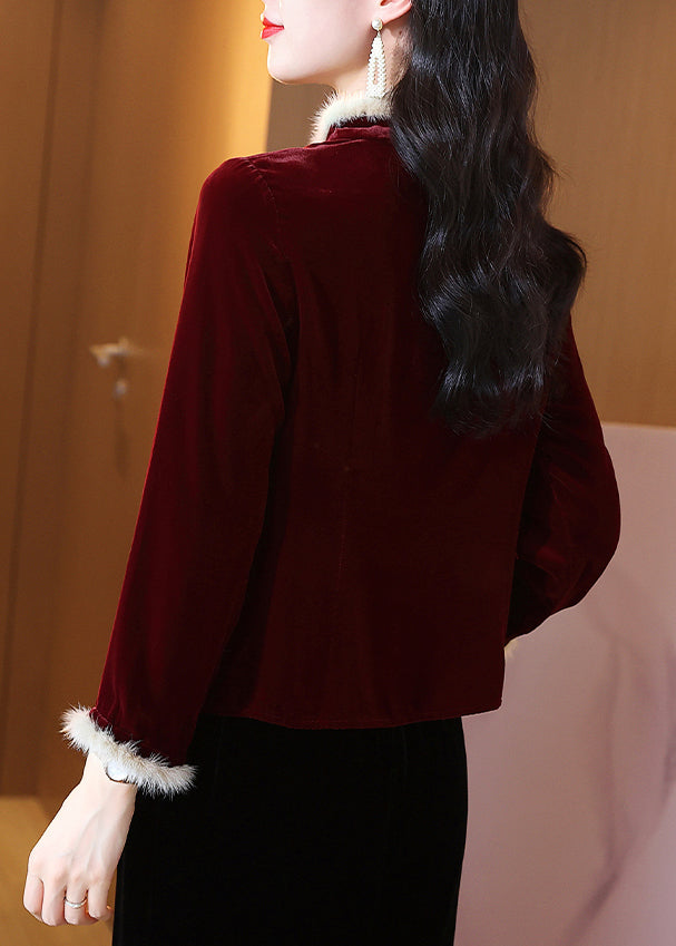 Art Mulberry Stand Collar Patchwork Faux Fur Silk Velour Tops Winter
