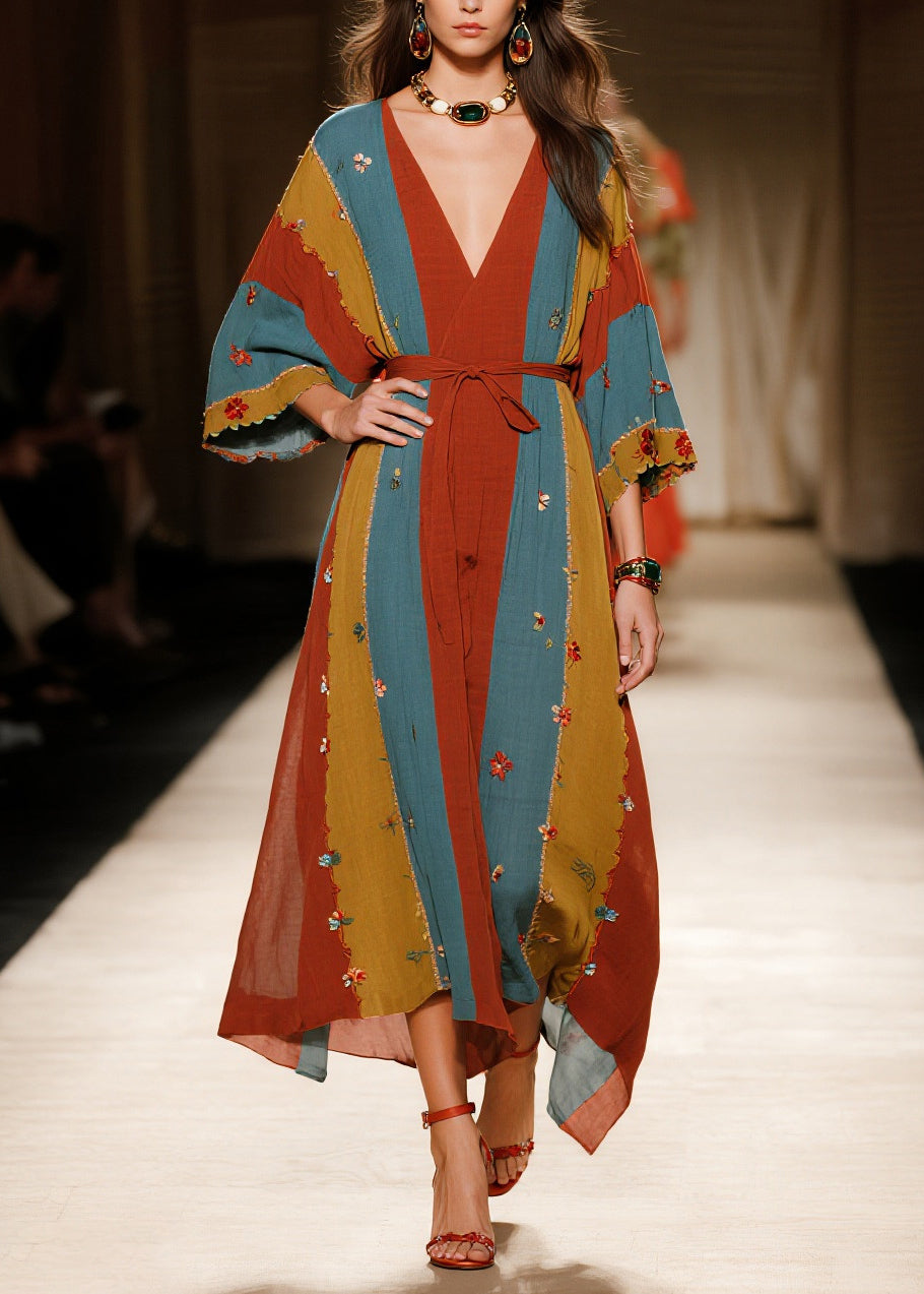 Art Multicolored Flower Tie Waist Striped Cotton Dresses Summer