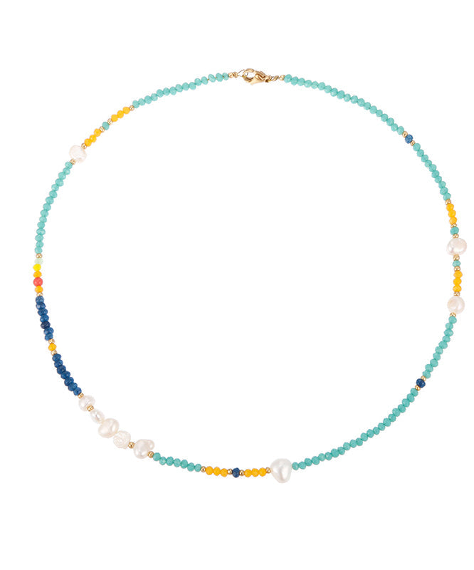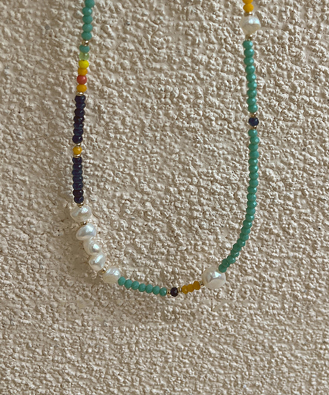 Hermoso collar de perlas de cristal doradas de acero inoxidable verde