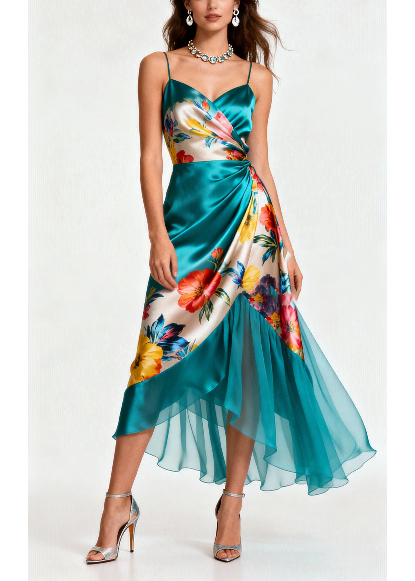 Beautiful Peacock Green Asymmetrical Patchwork Tulle Silk Cami Dress Summer